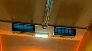 De units hangen in beugels aan het plafond. Door deze hoge positie en het ontwerp van de armaturen kan het systeem de lucht desinfecteren terwijl deze door de ruimte circuleert, zelfs wanneer er mensen aanwezig zijn.
