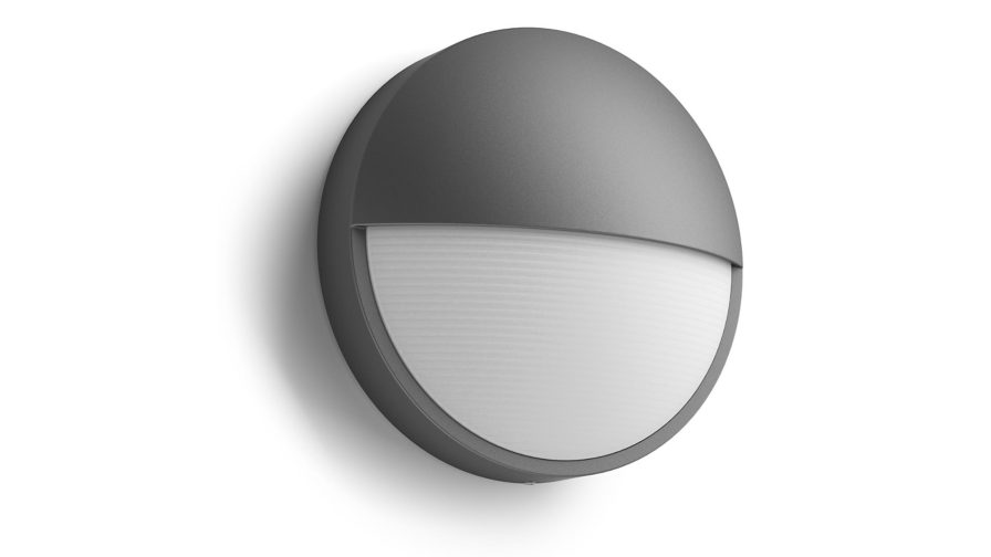 Cette applique murale LED d'extérieur Philips Capricorn en forme de dôme d'une élégante couleur gris anthracite est en aluminium moulé durable. Son design raffiné en demi-lune apporte aux espaces extérieurs une lumière blanc chaud puissante mais diffuse.